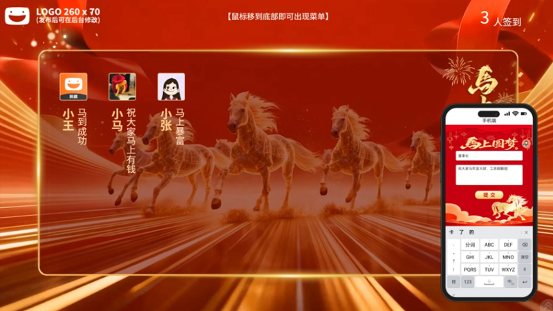 扫码签到时可以输入姓名和祝福语,提交之后大屏上会同步滚动展示名称和祝福语,适合活动或者年会开场时候的预热